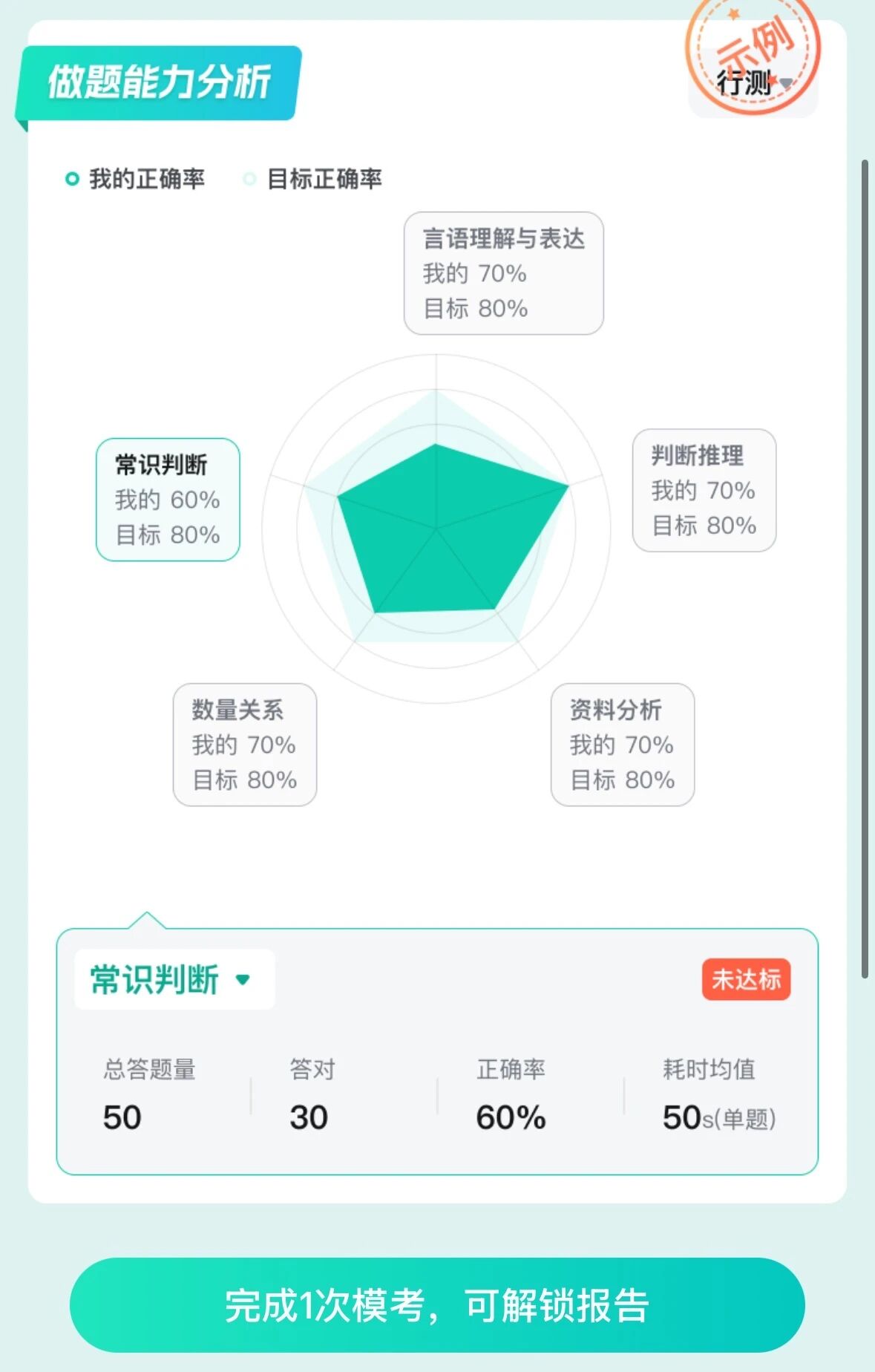3??生成個(gè)人??紙?bào)告:考完就能查看??汲煽?jī)、排名及解析,生成的個(gè)人??紙?bào)告包含各模塊正確率分布、做題能力分析、筆試分?jǐn)?shù)yu測(cè)等內(nèi)容。