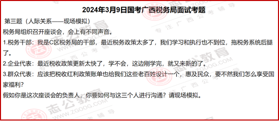 3??人際關系題:以 “座談會現(xiàn)場模擬” 的形式,直接還原稅務工作中的溝通場景 —— 既要回應干部的 “政策學習壓力”,也要解決企業(yè)的 “政策更新焦慮”,還要滿足群眾的 “紅利獲得感訴求”,考察的是 “換位思考 + 實務解決能力”。